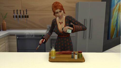 初心者の世代交代プレイ 目次 37日目の日曜日。フレアが早起きして朝食を用意するようです。 作っているのはビーフ・ウェリントンです。いや人生初めての料理に選ぶメニューじゃないと思いますビーフ・ウェリントンは。スクランブルエッグとかから始めた方が…